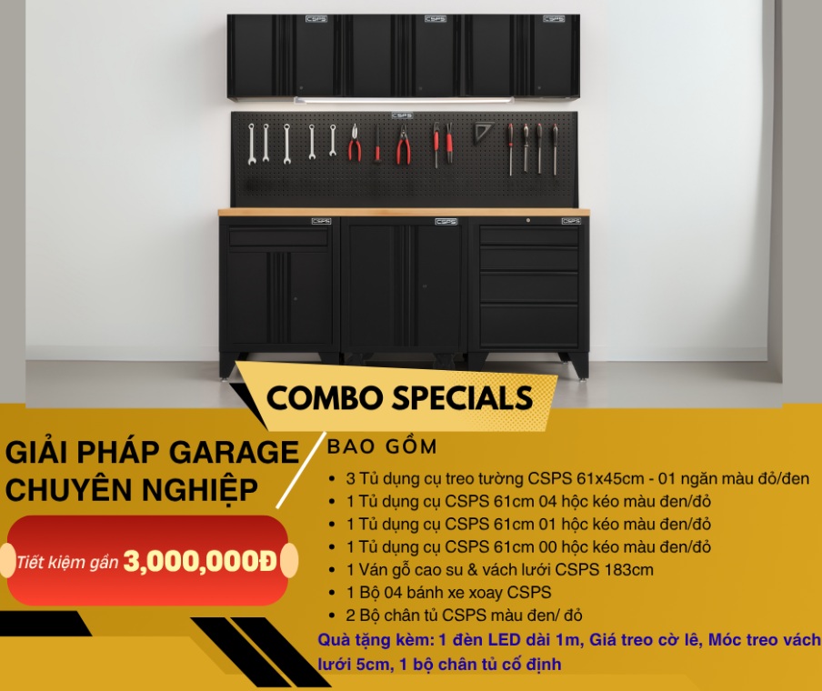 Combo CSPS – Giải Pháp Garage Chuyên Nghiệp mang đến không gian làm việc hiện đại, ngăn nắp và chuẩn công nghiệp Mỹ. Bộ sản phẩm được thiết kế đồng bộ gồm tủ đồ nghề, bàn thao tác, tủ treo tường và kệ lưu trữ, giúp tối ưu diện tích và nâng cao hiệu suất làm việc trong garage hoặc xưởng kỹ thuật.