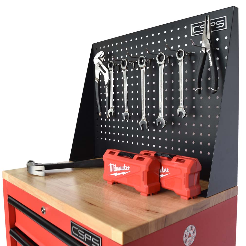 Trang bị vách lưới tiện lợi, dễ dàng treo kìm, búa, mỏ lết, thước… giúp dụng cụ luôn trong tầm tay.