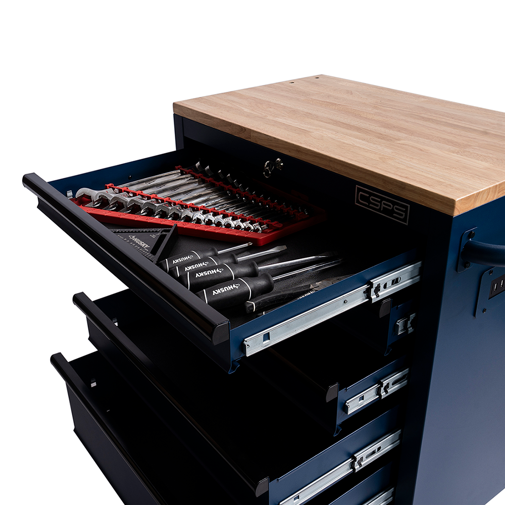 Tủ dụng cụ CSPS 76cm – 05 hộc kéo không nâng hạ (màu đen/ xanh) là lựa chọn hoàn hảo cho thợ cơ khí, garage, nhà máy hay cửa hàng sửa chữa. Tủ đồ thiết kế chắc chắn, tải trọng lên đến 680 kg, cùng 05 hộc kéo trượt êm giúp sắp xếp dụng cụ khoa học và bền bỉ theo tiêu chuẩn Mỹ.